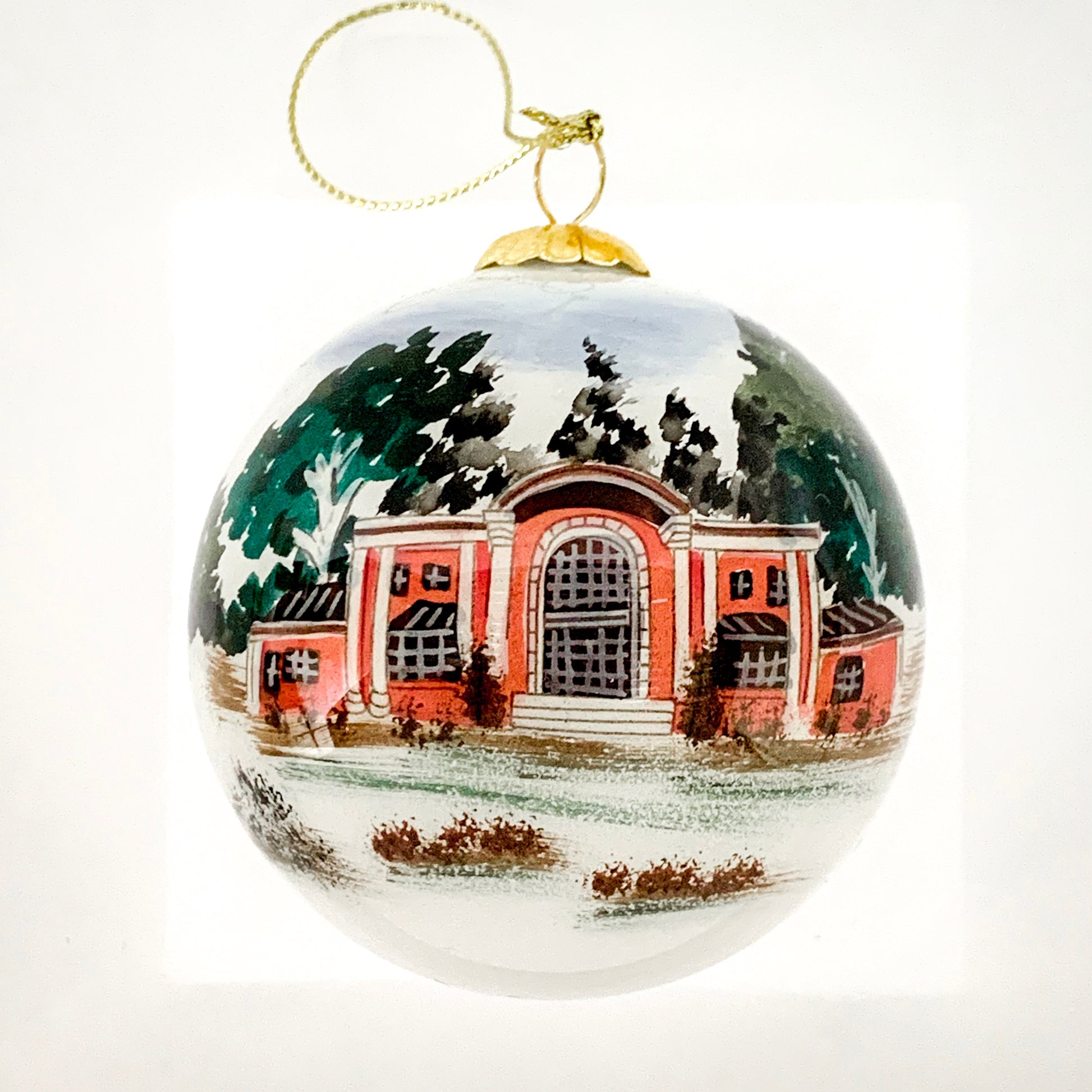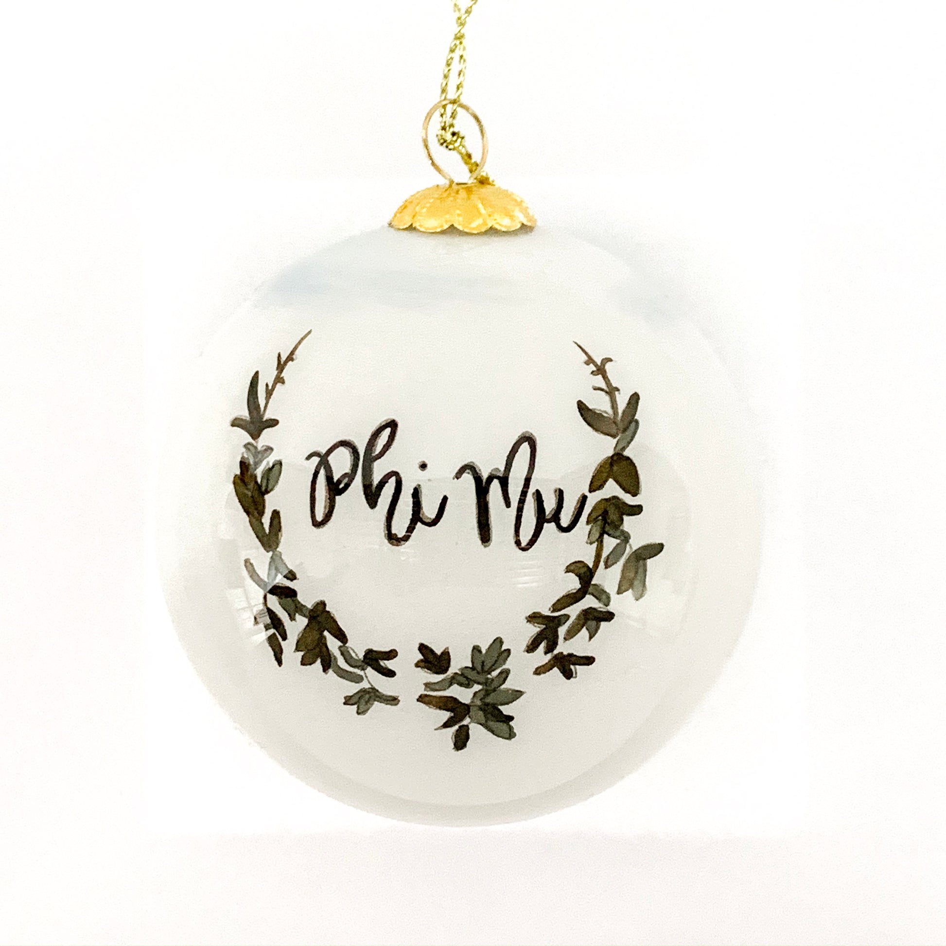 This beautiful, inside painted glass ornament continues an ancient art form prized by collectors. The artist, choosing from a selection of miniature curved and bent-shafted brushes, hand paints every minute detail on the inside of the hand blown glass ornament. In painstaking fashion the brush is repeatedly inserted through the opening in the glass, initially to outline the design followed by detailed application of the colors one by one. The entire hand painting process for each piece requires up to two days. No two pieces are ever identical. This inside painted glass ornament is a keepsake to be treasured from generation to generation. Created by the Art Studio company this ornament features Phi Mu National Headquarters on one side and Phi Mu in script on the other.